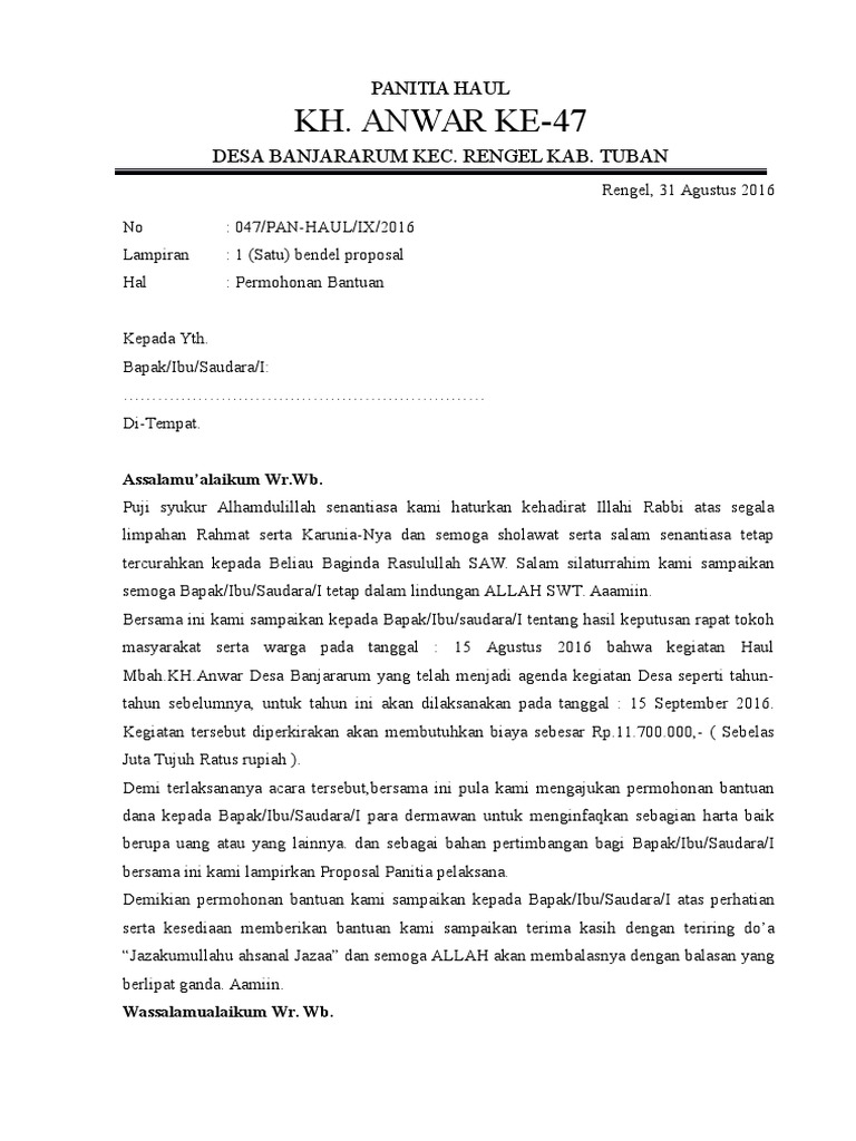 Yang terhormat Bapak Camat Jamanis. Ijinkanlah kami Panitia Hari Besar Islam di Musholla. Sambutan ketua panitia baksos panti asuhan terbaik.