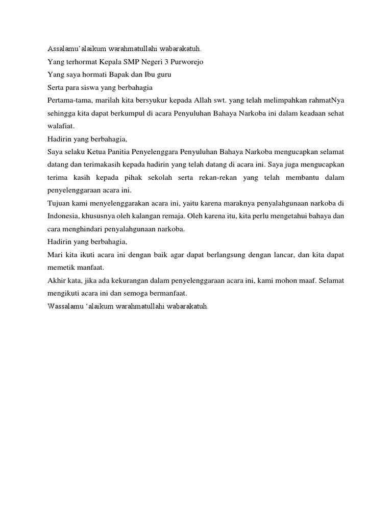 Contoh teks mc contoh teks mc program seminar narkotika. Karena itu sebagai ketua panitia kita harus pandai berbicara di depan umum. Contoh Kata Sambutan Menjadi Ketua Panitia Suatu Acara.