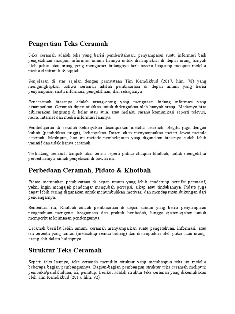 Dikutip dari Terpikat Terampil Pidato Bermasyarakat oleh Tim. Berikut ini kumpulan contoh-contoh teks ceramah lengkap. Hal tersebut telah tertuang dalam UUD 1945 dan dikonkretkan lebih lanjut dalam UU 20 tahun 2003 mengenai sistem pendidikan nasional.