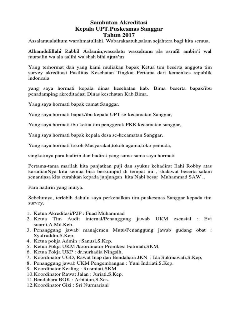Pidato Ketua PKK pada acara Sosialisasi HIV AIDS Pidato Pelantikan Kepala Desa Pidato Sambutan Rapat Koordiansi Baznas Pidato Serah Terima Ketua Dharma wanita Persatuan DWP Pidato Sambutan Gapoktan Kelompok Tani Pidato Sambutan Khotmil Quran Haflah Pondok Pesantren Pidato Sambutan Kebun Bibit. Pelantikan Anggota Tim Penggerak PKK Desa Arenan di laksanankan pada hari Rabu tanggal 10 April 2019 di buka dengan bacaan bacaan Basmallah dan menyanyikan lagu Indonesia Raya dan di lanjutkan dengan pembacaan doa Kepala Desa Arenan Bapak H. Dalam sebuah acara resmi kata sambutan menjadi salah satu hal penting yang harus disampaikan.