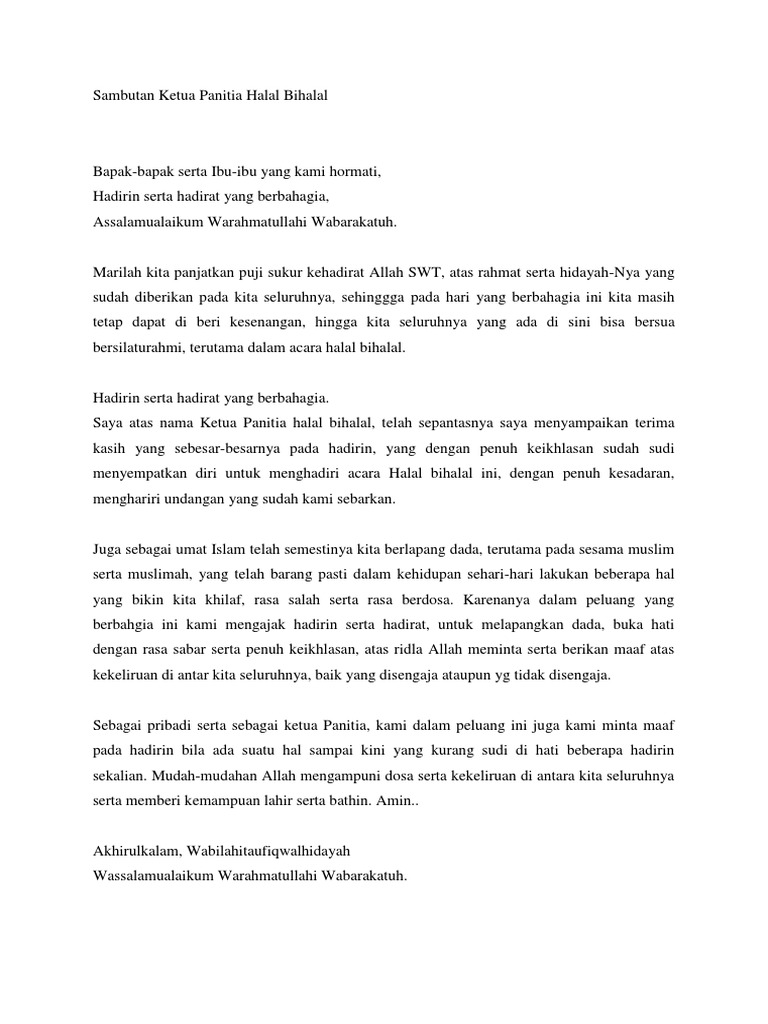 Assalamu alaikum warahmatullahi wa barakatuh Bismillahirrahmanirrahim Alhamdulillahi rabbil alamin Wabihi nas tainu ala ummuridunya waddin Washolatu wassalamu ala asrofil ambiya iwal mursalin waala alihi wasohbihi aj main. Dan jika anda ditunjuk sebagai ketua panitia acara halal bihalal dan diminta untuk menyampaikan kata sambutan dibawah ini kami akan memberikan beberapa contoh. Sambutan halal bihalal oleh ketua panitia halal bihalal adalah satu point yang wajib ada dalam susunan acara halal bihalal.