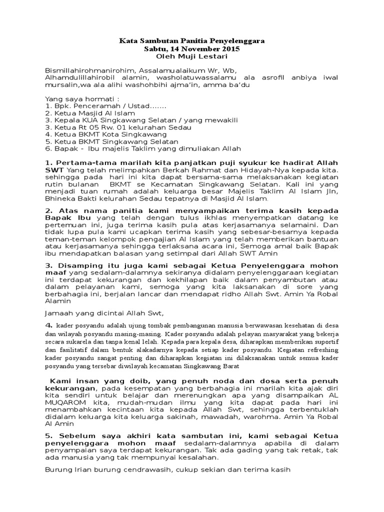 Sambutan kades dalam peringatan maulid nabi muhammad saw sebelumnya telah di sajikan juga contoh sambutan ketua panitia peringatan mauli. Kata Sambutan Majelis Taklim Terbaik. Contoh Sambutan Ketua RT Acara Pengajian Keagamaan.