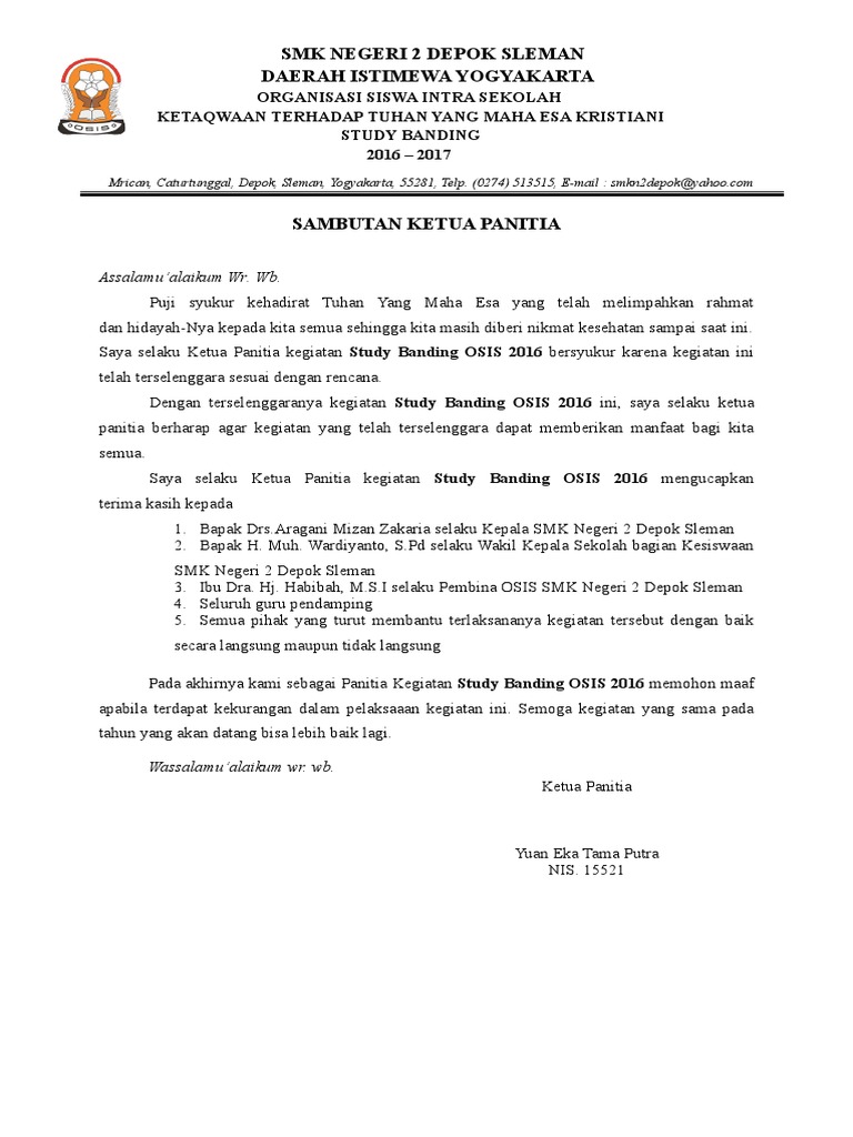 Contoh sambutan ketua panitia osis. Hasil Musyawarah Warga RTRW 05011 pada tanggal 5 April 2015. Sambutan Ketua Osis Lama dalam Pemilihan Ketua Osis Baru. Shalawat serta salam tak lupa kita limpah curahkan.