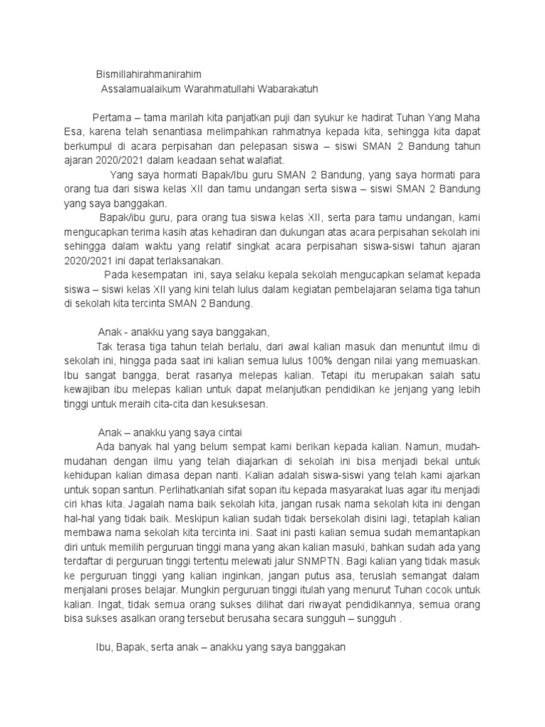 Biasanya dalam momen perpisahan tersebut seorang ketua OSIS akan diminta untuk memberikan pidato sambutan perpisahan. Bismillahi rahmani rahimassalamu alaikum wr. Acara perpisahan pada pagi hari ini merupakan rangkaian kegiatan berdasarkan hasil voting siswa kelas 12 sebelum siswa kelas 12 melaksanakan ujian nasional dari 5.