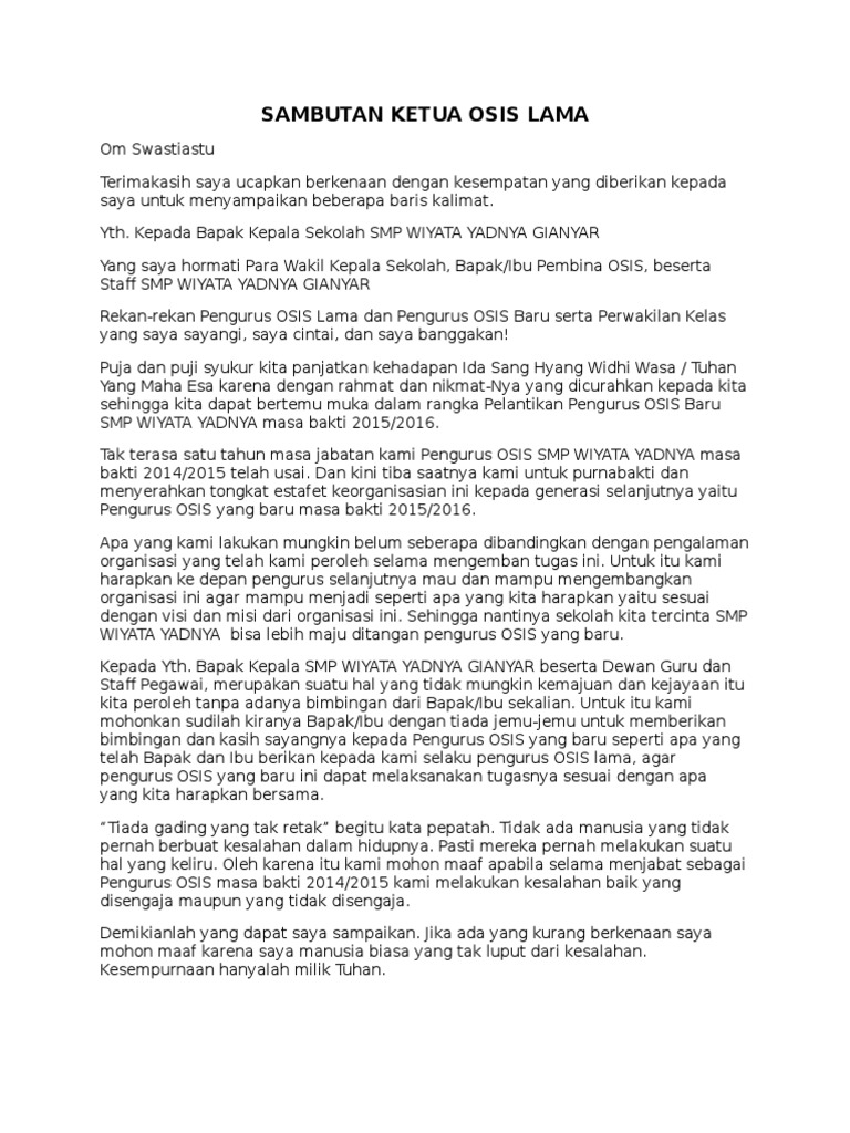 Sebagai Ketua Organisasi Siswa Intra sekolah Osis saya sangat merasa kehilangan atas acara perpisan ini kehilangan teman-teman yang sebentar lagi akan meninggalkan sekolah ini karena sebagai alumni tetapi semua itu adalah sebuah tuntutan perpisahan secara kelembagaan maka itu kami dan anggota Osis lainnya berharap untuk tidak melupakan kami. Kata Sambutan Ketua Osis Dalam Acara Perpisahan Kelas 12 SMK. Ucapan kata pamitan disampaikan oleh Ria Puspitasari XII Aph 2 Ketua OSIS lama berharap bahwa acara pelepasan perpisahan kelas XII ini adalah penundaan untuk bertemu kembali dan tidak dimaknai dengan perpisahan yang identik dengan perasaan sedih walaupun penuh rasa haru dan air mata akan tetapi agar dapat memaknai perpisahan ini dengan.