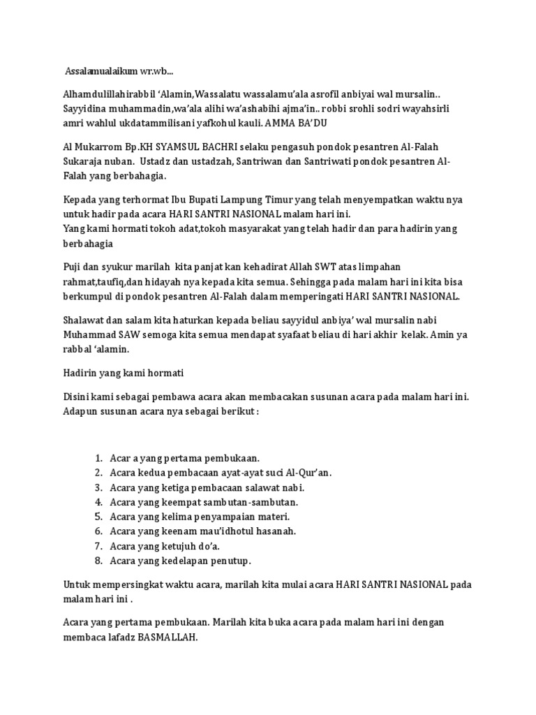 Pidato Amanat Ketum PBNU untuk Hari Santri 2017. Berdirinya saya disini merupakan wakil dari teman-teman panitia penyelenggara acara pengajian dalam rangka peringatan hari santri nasional ini akan menyampaikan beberapa patah kata. Acara Mc Hari Santri Nasional Docx.