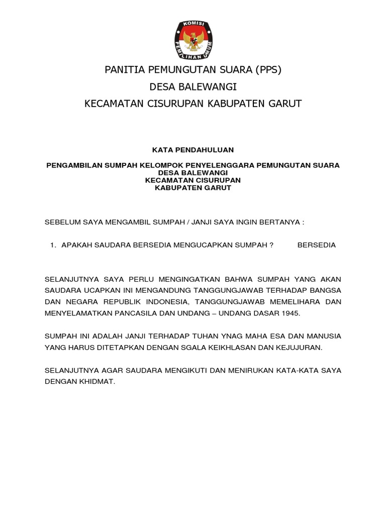 Naskah Pelantikan Dan Sumpah Doc Document. Panitia pelaksanaan pemilihan calon ketua rt bubulak bojong enyod rt 04 16 keltegal gundil kecbogor utara kota bogor bogor 16 oktober 2013 kepada yth. SAMBUTAN KETUA BPD DESA POJOK.