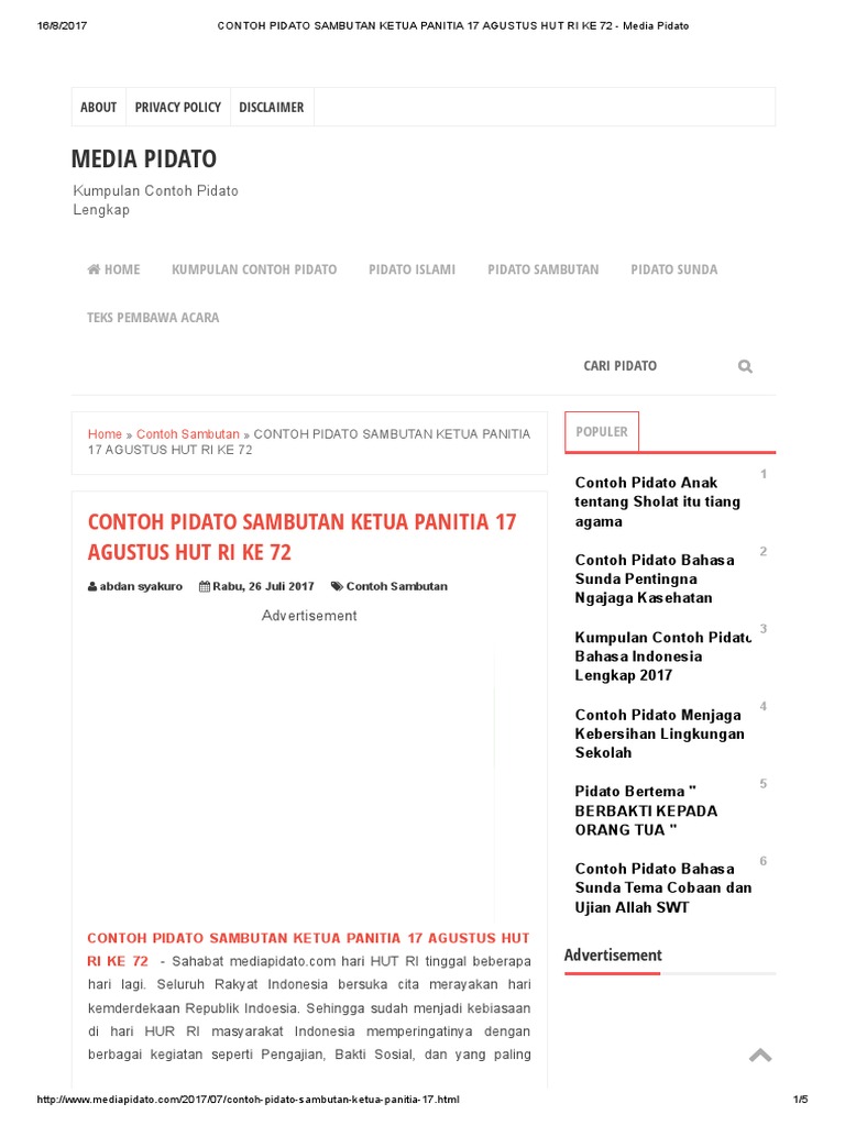 Contoh Pidato Sambutan Ketua Panitia 17 Agustus Hut Ri Ke 72 Media Pidato Pdf