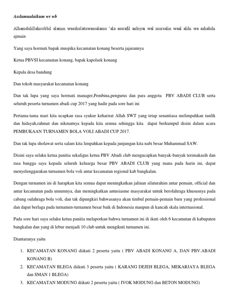 Teks sambutan ketua panitia turnamen bola voli. Rancangan Teks Mc Upacara Pembukaan Kejuaraan Nasional Shorinji Kempo Babak Kualifikasi Pekan Olahraga Nasional Jawa Barat Tahun 2015 Docx. Pembukaan open turnamen volly ball antar klub se sumbar di padang. Doa Pembukaan O2sn.