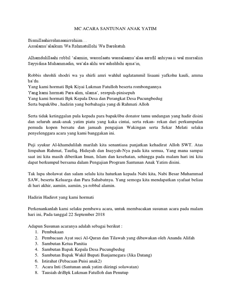 Contoh susunan acara santunan anak yatim lengkap terbaru. Puji syukur kehadirat Allah SWT karena sampai hari ini kita masih diberi kenikmatan iman dan islam serta kesehatan sholawat serta salam semoga tetap tercurahkan kepada junjungan kita nabi besar Muhamad SAW. Pidato pembawa acara khotmil quran kepada sesepuh dusun banyurip serta koo.