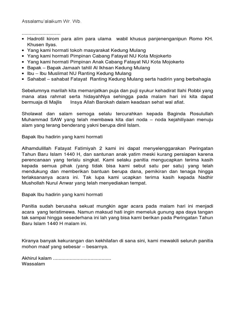 Yang terhormat Bapak Kepala Desa Sindangraja. Contoh Sambutan Ketua Panitia Pengajian 1 Muharam Assalamu alaikum wr.