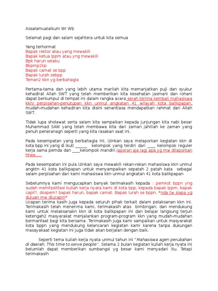 Sekian dari saya selaku perwakilan teman-teman mahasiswa KKN Kuliah Kerja Nyata terima kasih untuk waktu yang sudah dipercayakan kepada saya untuk memberikan pidatosambutan ini kurang lebihnya kami mohon maaf bila mana ada salah kata yang kurang berkenan dihati anda sekalian. Mc Perpisahan Kkn. Contoh Kata Sambutan Ketua Panitia Perpisahan Kkn.