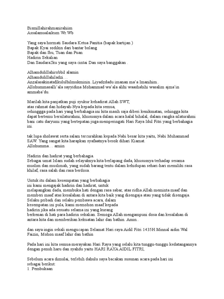 Susunan Acara Halal Bihalal Susunan acara dan text acara halal bihalal. Yang saya hormati Saudara Ketua Panitia bapak kartijan Bapak Kyai sodikin dari bantar bolang. Contoh Kata Sambutan Ketua Panitia Acara Anniversary Dunia Belajar.