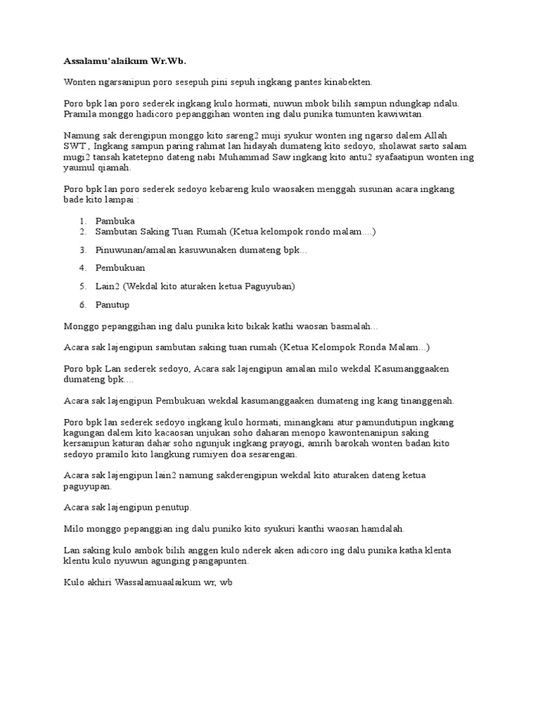 Dhumateng panjenenganipun para pepundhen para sesepuh pinisepuh ingkang hanggung mastuti. Kata sambutan tuan rumah acara pengajian sambutan tahlilan bahasa jawa pembawa acara yasin tahlil sambutan tuan rumah acara syukuran mukadimah kematian mukadimah mc acara haul sambutan 7 bulanan singkat sambutan. Teks pidato merupakan suatu wujud komunikasi satu arah guna mengungkapkan sebuah gagasan pokok terkait beberapa hal pada orang lain dengan tujuan mengajak orang lain agar melakukan apa yang disampaikan.