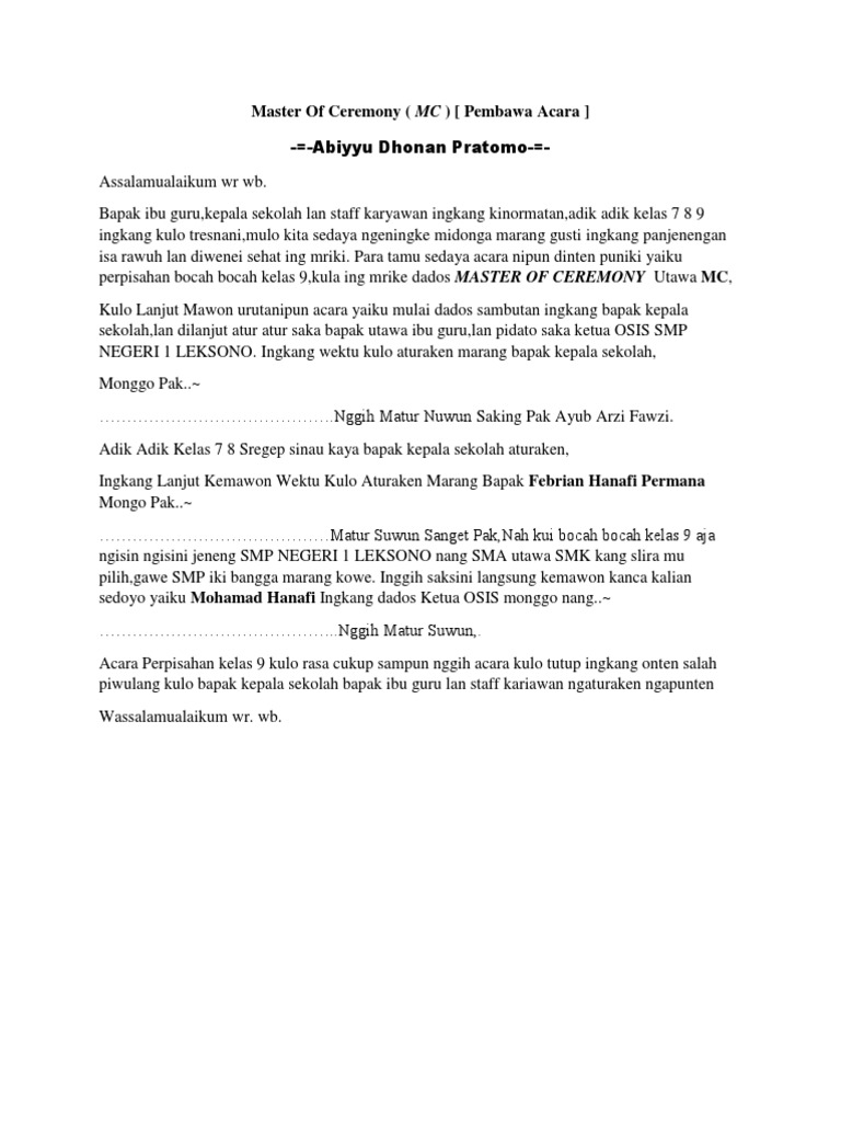 Teks pranatacara bahasa jawa acara pengajian Assalaamualaikum warahmatullaahi wabarakaatuhu Innalhamdalillaah nahmaduhu wanastainuhu wanastaghfirruhu wanauudzubillahi min syuruuri anfusina wa min sayyiati amaalina may yahdihillahu fala mudzillalah wa may yudlill fala haadiyalah asyhadu an-laailaaha illallaah wahdahu laa syariikalahu wa asyhadu anna muhammadan. Pidato Pamitan Kelas IX Bahasa Jawa. Secara harfiah MC artinya penguasa acara pembawa acara atau pemandu acara.