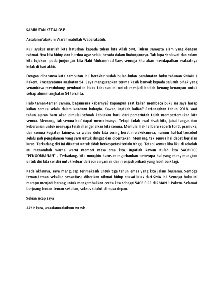 Sambutan Ketua OSIS dalam Buku Tahunan. Semoga keberhasilan ini akan lebih bermakna suka cita dengan lulusnya ananda semua dalam Ujian Nasional dan. Kata sambutan ini kebiasaannya disampaikan oleh ketua panitia pada beberapa acara disebut dengan laporan ketua panitia ataupun dari kepala instansi ketua.