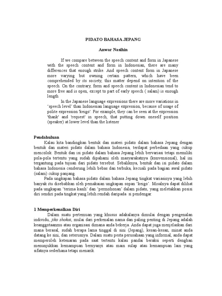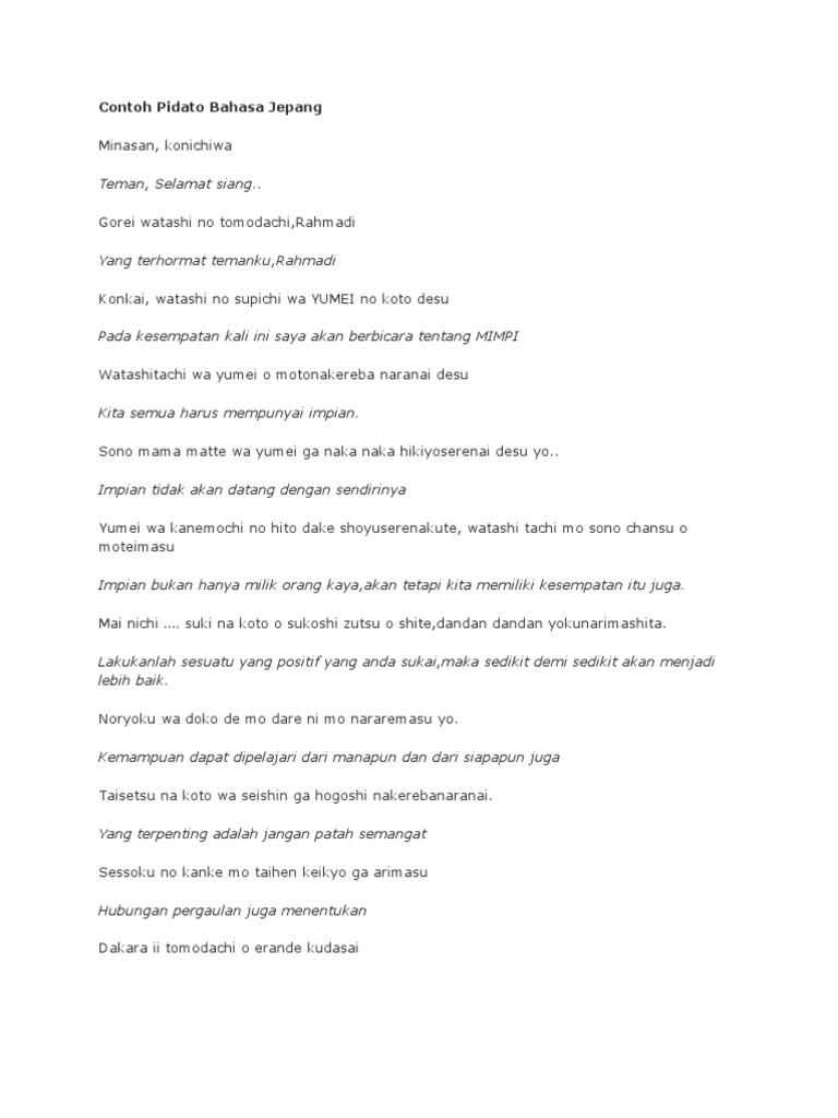 Jadi selanjutnya selamat belajar. Use the download button below or simple online reader. Kali ini contoh teks pidato akan menyuguhkan contoh pidato bahasa jepang dan artinya bagi anda yang ingin belajar berpidato dengan bahasaya jepang contoh pidato bahasa jepang dan artinya ini mungkin akan sangat bermanfaat.