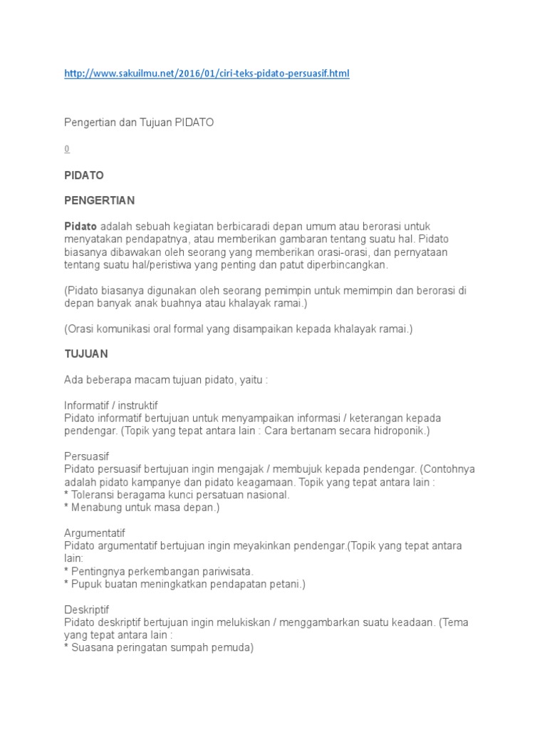 Contoh Teks Pidato Persuasif dalam Bahasa Inggris tentang Kampanye Contoh pembukaan pidato persuasif singkat formal. Bapak Ibu dan saudara sekalian yang saya hormati dan saya cintai Puji syukur kehadirat Allah SWT hari ini saya bisa bersilaturahmi dengan Bapak Ibu semuanya dalam rangka acara diskusi tentang masa depan Kabupaten Purbalingga kita tercinta ini. Mengutip buku Super Complete SMPMTs 78 9 oleh Tim Guru Inspiratif pidato.