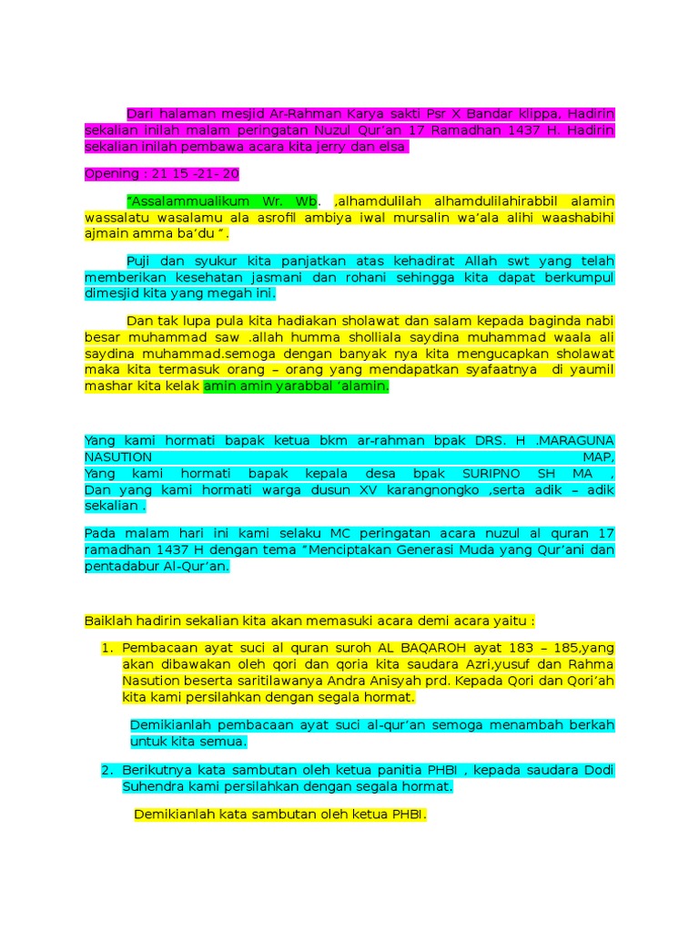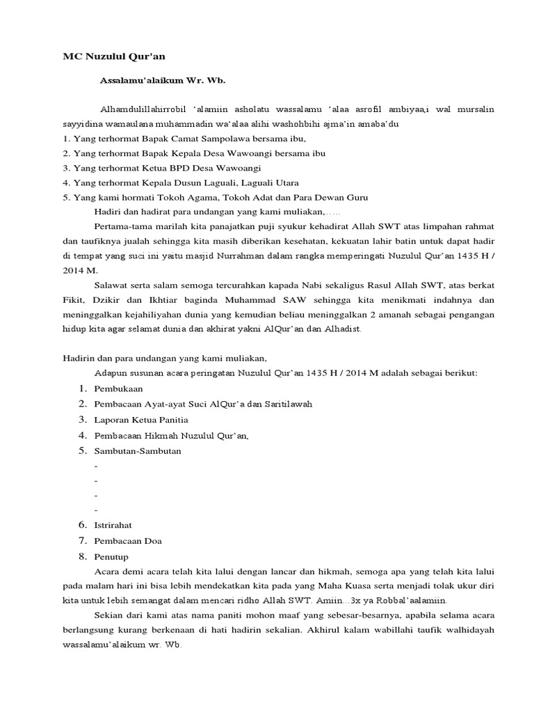 Susunan acara pada mala peringatan Nuzulul Quran ini. Nuzulul quran adalah proses turunnya firman dari allah swt melalui malaikat jibril kepada nabi muhammad saw sebagai. Pidato sambutan atas nama panitia atau sambutan atas nama panitia penyelenggara acara selalu ada dalam sebuah acara entah acara formal maupun.