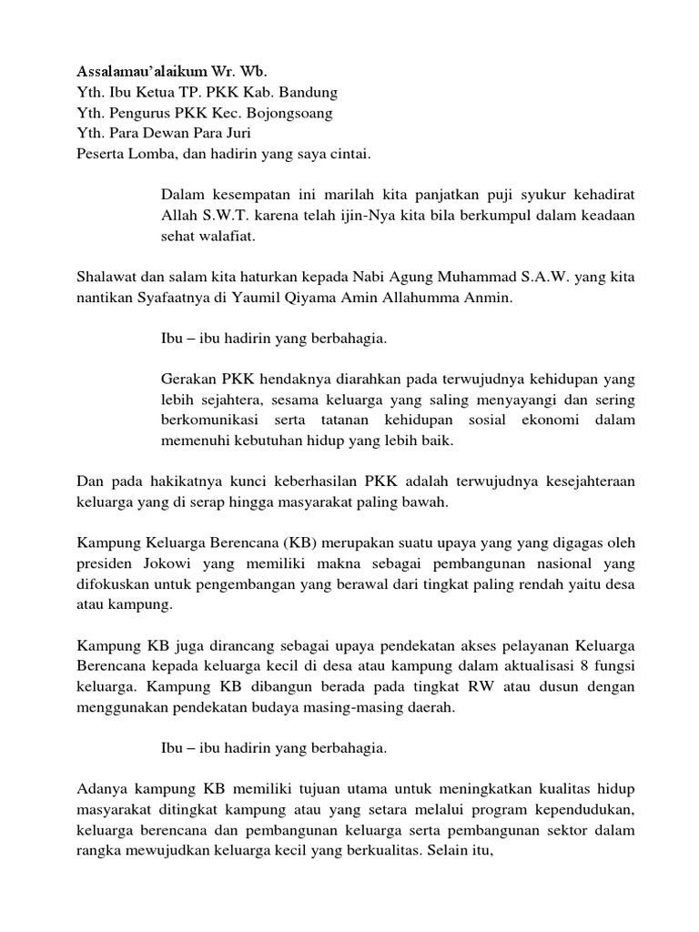 EKSPOSE KETUA TP PKK DESA LOSARI LOR RABU 24 APRIL 2013 Assalammualaikum wrwb Kepada yang terhormat ketua tim recheking perlombaan desa tingkat Kabupaten Cirebon beserta rombongan Yang saya hormati bapak camat Losari beserta jajaran muspika Yang saya hormati para kepala UPT se-kecamatan Losari Yang saya hormati ibu ketua tim pengerak. Contoh pidato selengkapnya download gratis disiniPKK sebagai unsur pembangunan bangsa memiliki misi mulia dalam memberi dukungan terhadap peningkatan kualitas hidup keluarga dengan mengutamakan SDM sejak bayi dalam kandungan hingga tumbuh dan berkembang menjadi balita remaja sampai lanjut usia. Pidato Ketua PKK Pada Pertemuan Pengurus Maupun Anggota.